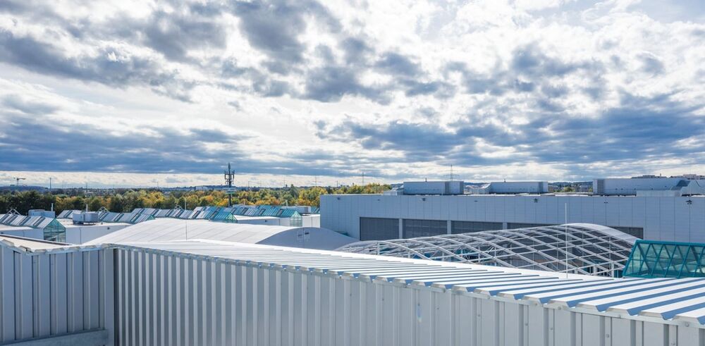 Een grote hal, maar slechts weinig ruimte voor de aanlevering – ook deze uitdaging kon worden aangegaan. De afzonderlijke behuizingsdelen werden verstevigd met schoorbalken, zodat de kasten uit zo min mogelijk afzonderlijke eenheden bestonden. Dit verkortte de montagetijd op de bouwplaats aanzienlijk. Elke luchtbehandelingskast werd getimed voor de aanlevering, zodat deze overeenkwam met het montageverloop ter plaatse. De aanlevering op het beursterrein vond uiteindelijk plaats in een gedefinieerd tijdvenster. Dit voorkwam dat wachtende vrachtwagens de toch al schaarse ruimte op de bouwplaats in beslag namen. Een geolied montageteam op het dak kon vervolgens de behuizingsdelen direct plaatsen en monteren – just in time zogezegd.
