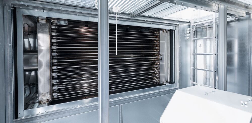 „We laten de servicetechnici niet in de regen staan – letterlijk.“ De schakelkasten voor de koudetechniek en de EM&R-techniek werden geïntegreerd in de luchtbehandelingskasten, maar bevinden zich buiten de luchtstroom. Servicetechnici kunnen dus ook tijdens het gebruik aan de schakelkast werken en dat doen ze dus beschermd tegen weersinvloeden.