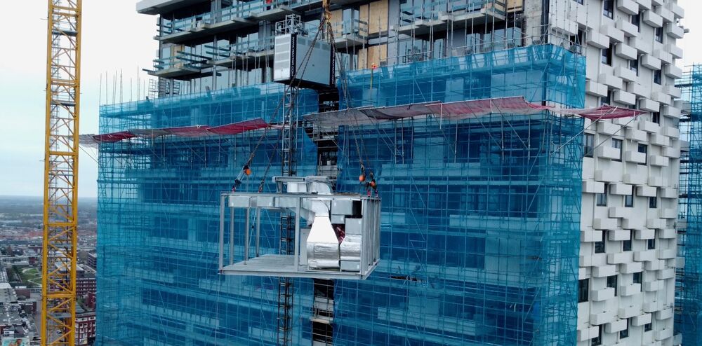 Insgesamt sieben RLT-Geräte sorgen für das Raumklima bei diesem besonderen Bauprojekt. Sechs RLT-Geräte wurden im Gebäude installiert und werden sowohl für die Büros als auch für die Wohnungen verwendet. Das letzte und größte RLT-Gerät wurde auf der Baustelle auf eine Plattform montiert und dann auf eine Höhe von 105 Metern gehoben und auf dem Dach platziert.