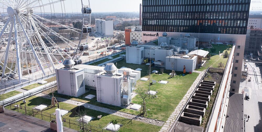 Het dakoppervlak van 2.500 m² is niet alleen een luchtige habitat voor kruiden en bloemen – maar ook een verhoogde verblijfplaats voor kippen, bijenvolken en Walliser zwartneusschapen. Om deze groene oase midden in de metropool te realiseren, kwam ook de expertise van robatherm om de hoek kijken.